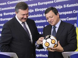 O presidente da Ucrânia, Viktor Yanukovych, entrega a Durão Barroso, presidente da Comissão Europeia, a bola oficial do Euro'2012. A prova será realizada entre Ucrânia e Polónia.